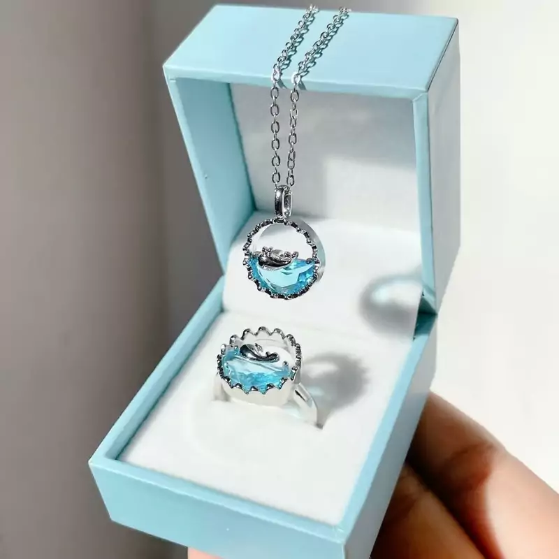 ست گردنبند و انگشتر طرح دلفین آبی استیل