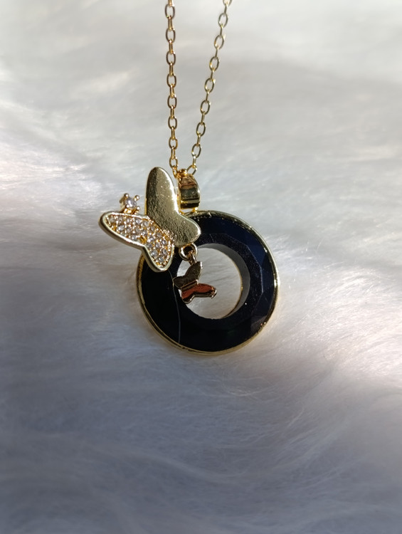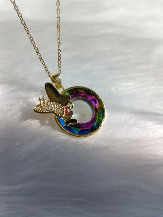 گردنبند زنانه با طراحی خاص پروانه و آویز دایرهای کریستالی چند رنگ (Iridescent)، ساخته شده از استیل درجه یک، در دو مدل پرفروش رنگینکمانی و مشکی مات موجود است.