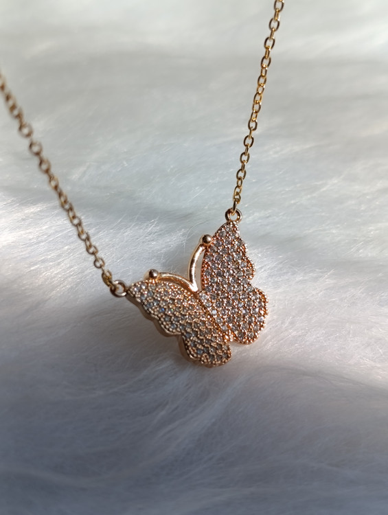 گردنبند زنانه شیک با آویز پروانه سه بعدی که تمام سطح آن با نگینهای درخشان پوشیده شده است. این مدل، یک انتخاب کلاسیک و لوکس با دوام بالا برای استفاده روزمره و مجلسی است.
