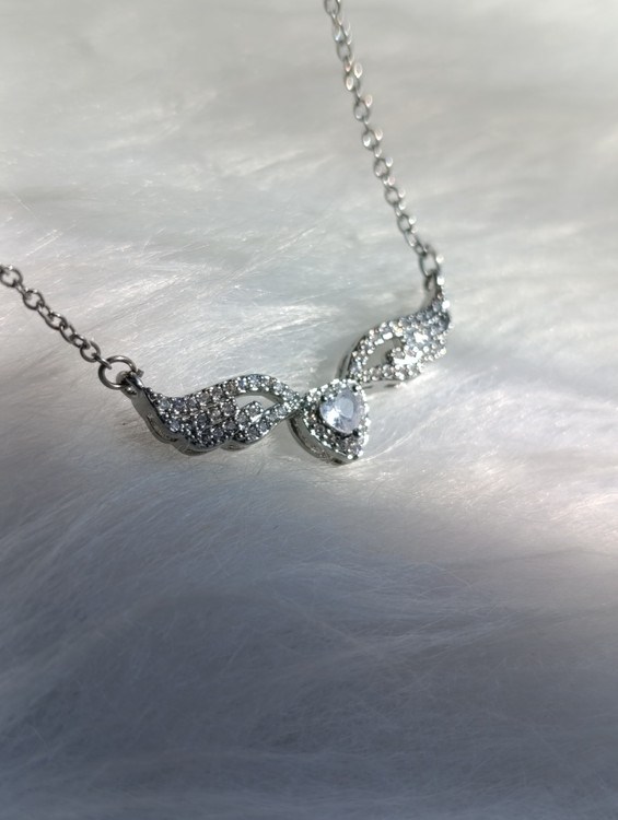 گردنبند زنانه شیک با طراحی آویز افقی طرح بال فرشته (یا پر) که با نگینهای ریز پوشیده شده و یک نگین قلب مرکزی برای درخشش بیشتر دارد. این مدل بسیار ظریف و مناسب برای استفاده روزانه است.