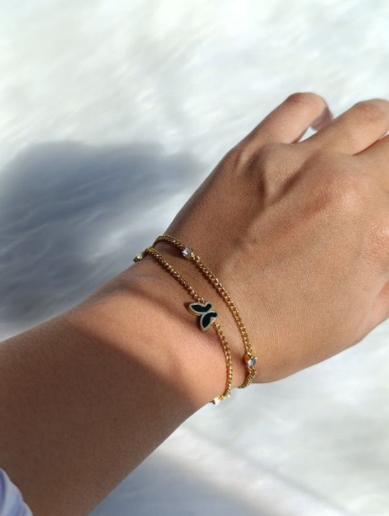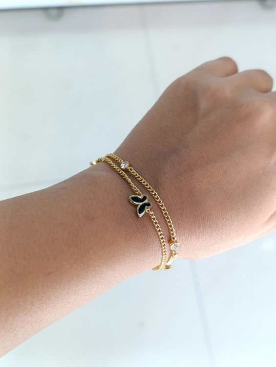 دستبند زنانه دولاین ظریف با آویز کوچک پروانه مشکی لعابکاریشده و تزئینات نگینی. این دستبند استیل، انتخابی مدرن و شیک برای استفاده روزانه و ست کردن با ساعت است