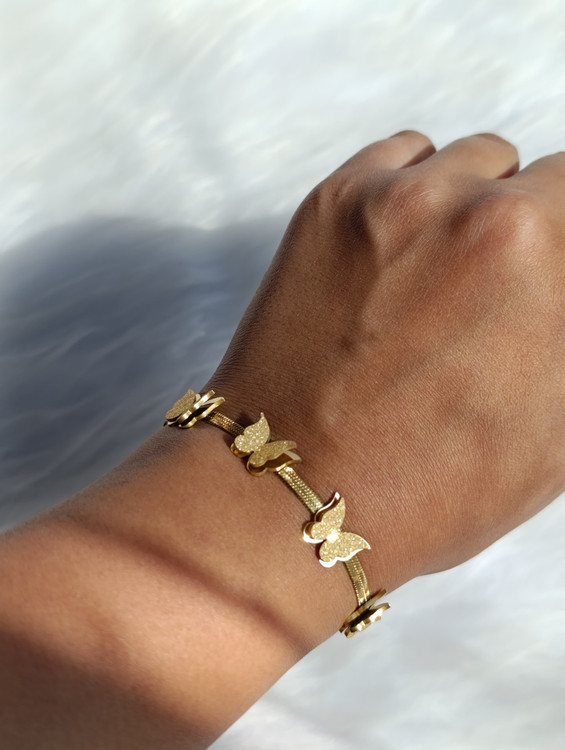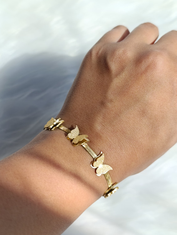 دستبند زنانه شیک با شش پلاک پروانه متصل که بافت بدنه آن شبیه به طرح حصیری است. این دستبند طلایی، انتخابی مدرن و درخشان برای استایلهای روزانه و مهمانی است.