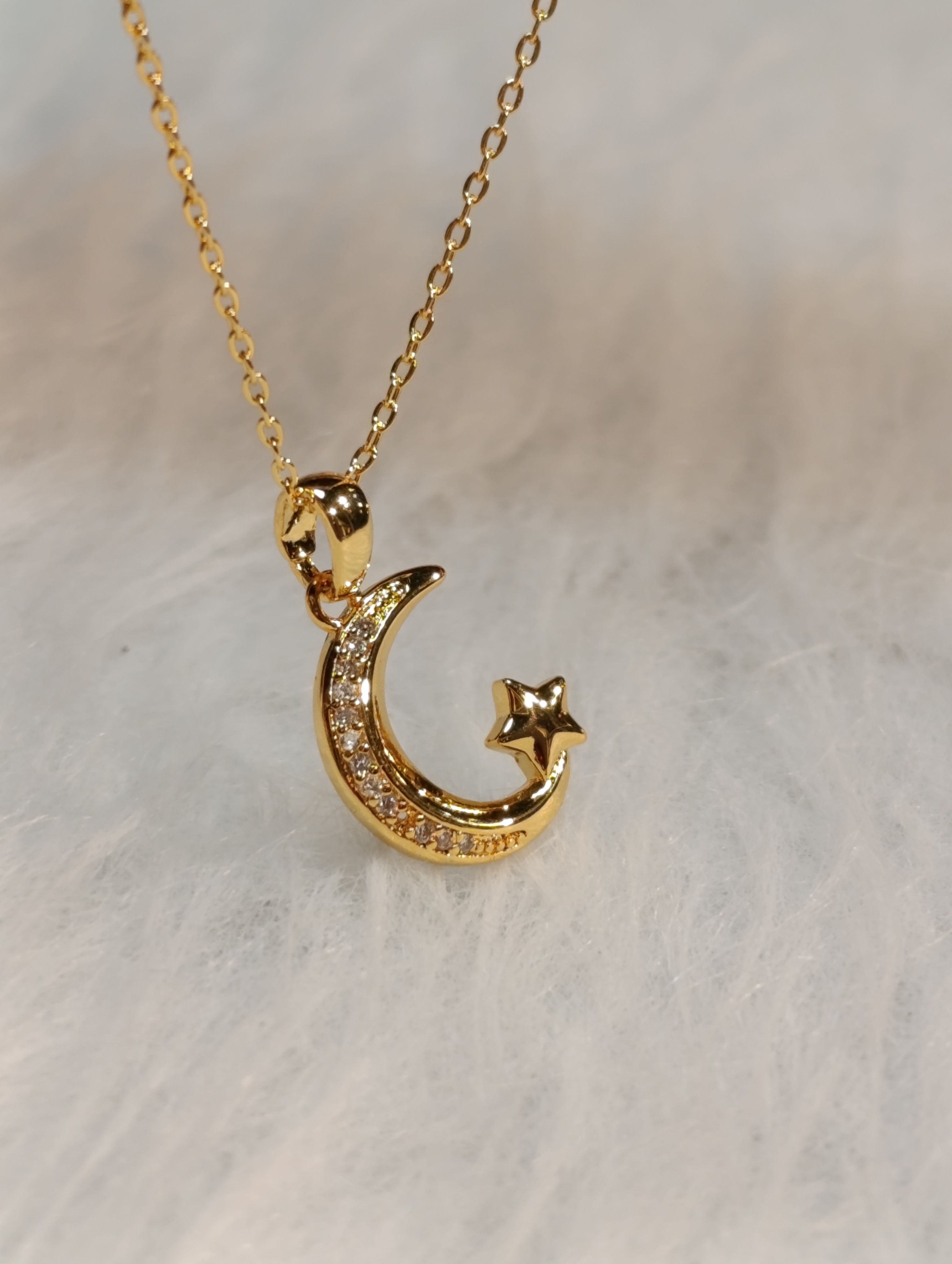 گردنبند ماه و ستاره (هلال ماه نگین‌دار) طلایی زنانه / دخترانه | استیل رنگ ثابت