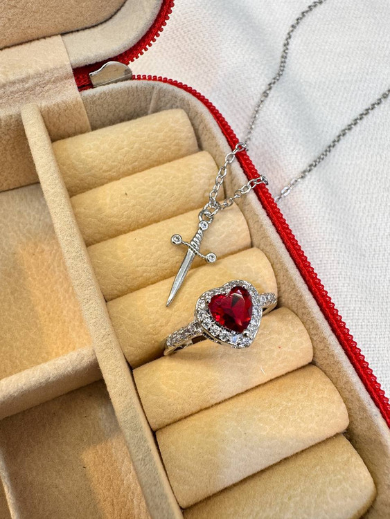 گردنبند ست قلب و شمشیر استیل نقره ای نگین قرمز